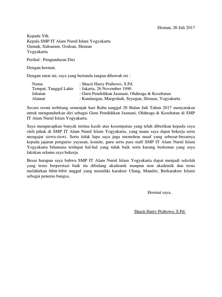 Surat pengunduran diri adalah surat yang dibuat oleh seseorang untuk menyatakan bahwa dirinya berhenti bekerja dari tempat atau instansi di mana ia bekerja, baik itu bekerja di perusahaan swasta ataupun bekerja di kantor pemerintahan. Berikut contoh ringkas beberapa surat pengunduran diri resmi dari profesi guru, karyawan swasta, hingga organisasi kemahasiswaan. The collection that consisting of chosen picture and the. Contoh surat pengunduran diri dari jabatan kepala sekolah kepada yth : Saya yang bertanda tangan di bawah ini :